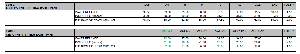 Adults and Kids Tops Size Guide